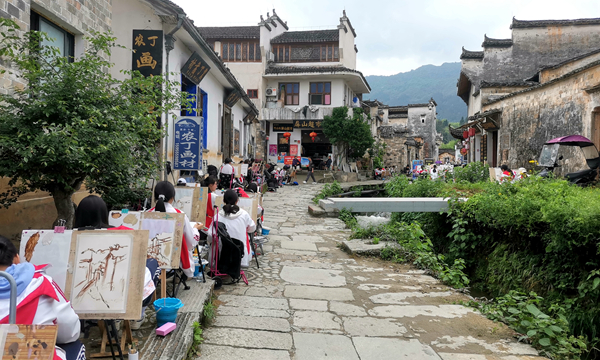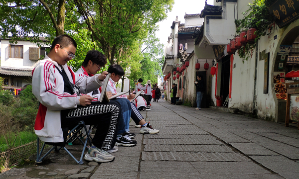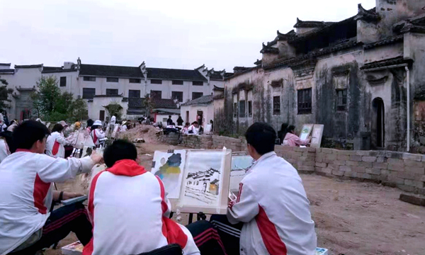 在宏村镇屏山村古村落,美术师生观赏徽派古建筑。村内保存完好的明清民居与旖旎的山光水色交相辉映,动静相宜,处处是景,步步入画。他们或手拿炭笔,静静完成建筑素描作品;或笔蘸水粉颜料,画着水粉风景画。专业教师从旁指导,亲自范画,启发学生对徽派风光的画面构图及明暗变化,逐步提升他们审美及表现能力。