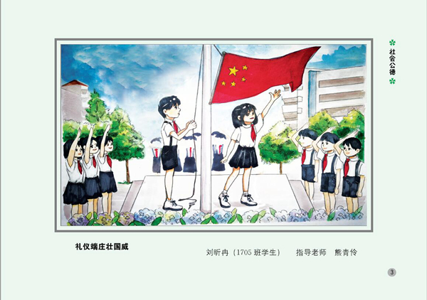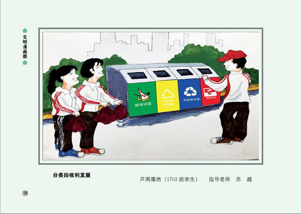 画册以社会公德、职业道德、家庭美德、个人品德、文明故事、文明传承等六个篇章,将社会主义核心价值观以漫画这种喜闻乐见的形式呈现,传递文明、倡导新风,春风化雨、润物无声。画册文字内容由我校陈丰华、周永军、祝黎黎、毛静、张薷菲、杨军、陈晶等老师负责,图画内容由张立、陈承、熊青伶、苏越、王威、张靖华、杨霄、付晶晶、王荣林、贾世雄、刘丰等美术老师指导,美术班学生手绘。