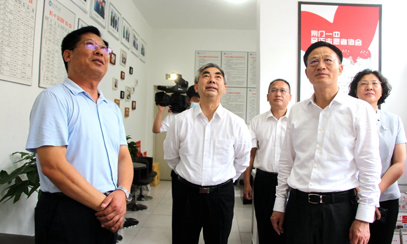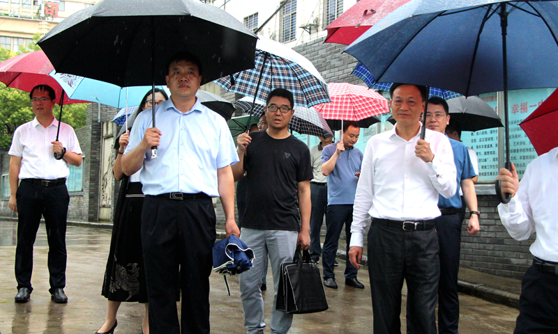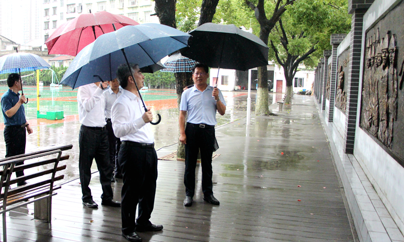 省委宣传部副部长余红岚(右一)检查工作,市委常委、宣传部部长汪在祥(左一),市教育局局长卢学新(左二)陪同。