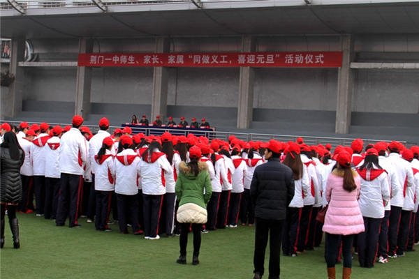 为加强品正校园文化建设,践行社会主义核心价值观,传递正能量,培养责任公民,12月30日,荆门一中在运动场举行“同做义工,喜迎元旦”义工启动仪式。参加启动仪式的领导有市委常委、宣传部部长吴朝安,市教育局局长舒君、副局长张治鹏,市义工联合会会长彭于柏,校长原野,另外还有学生家长代表、教师家属代表共600余人。