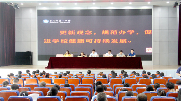 党委书记谢泽滔做动员报告。结合师德建设新形势,要求全体教师牢固树立爱校、爱岗、爱生的“三爱”理念,增强教书育人的责任感,提升师德修养,做有爱心、有责任、有能力的“三有”好教师。